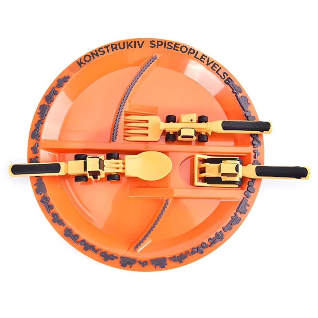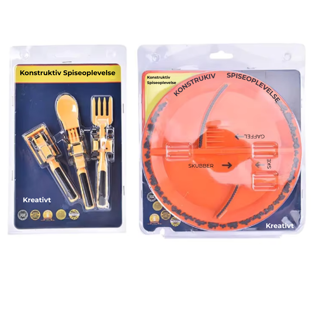 Kør gennem måltidet! Hvert bestik er kreativt formet som bildele og værktøj, hvilket vækker børns fantasi og gør hvert måltid til et interaktivt kapløb.