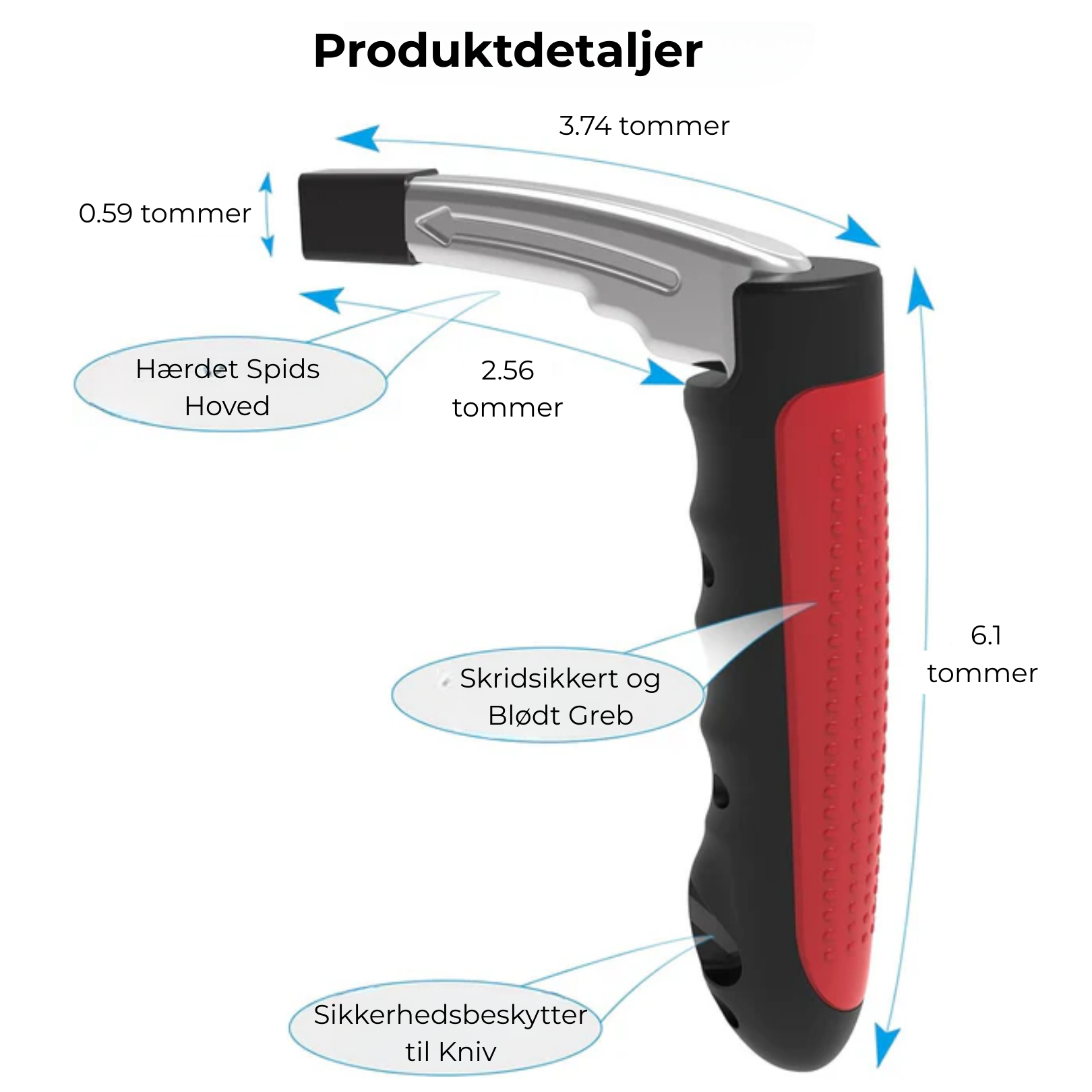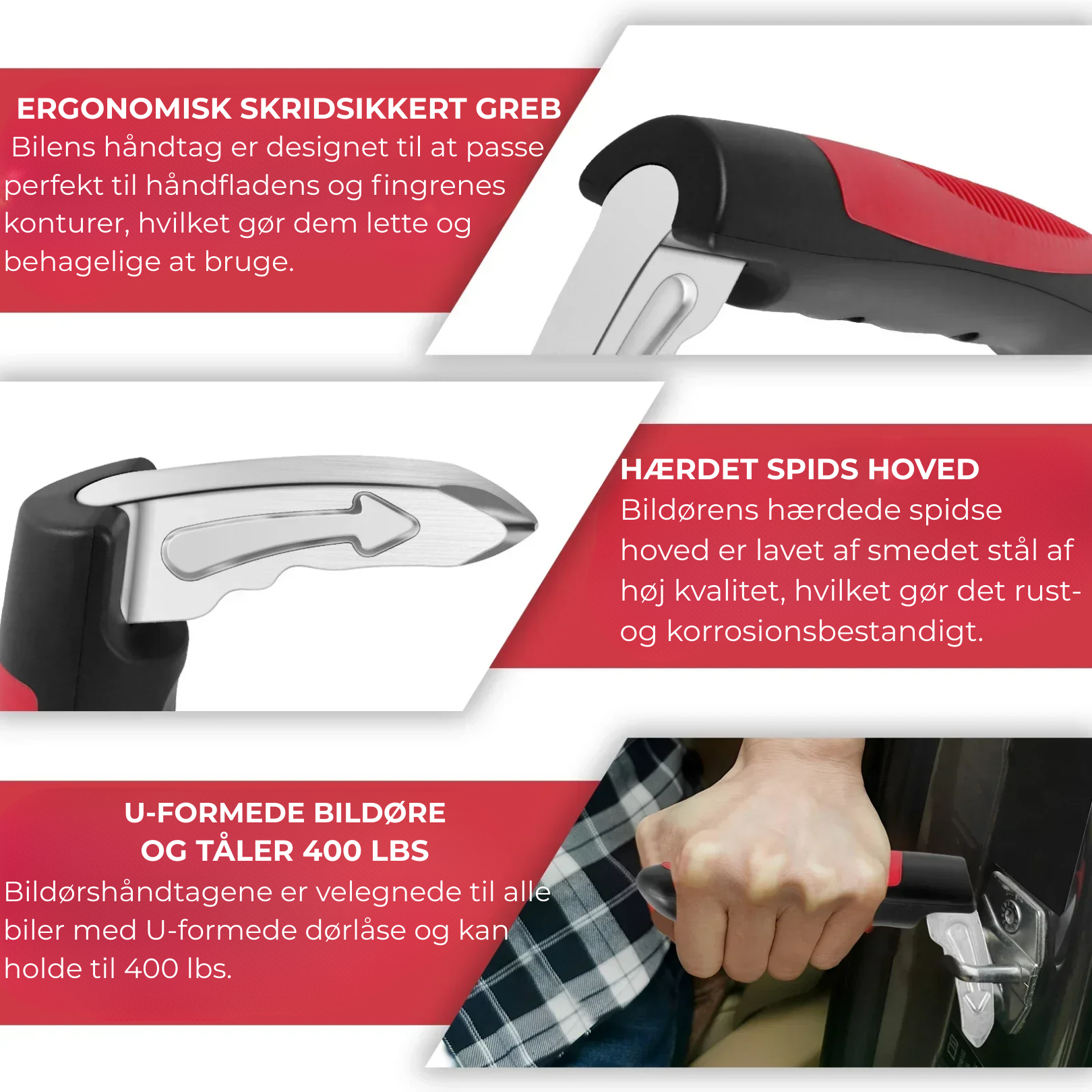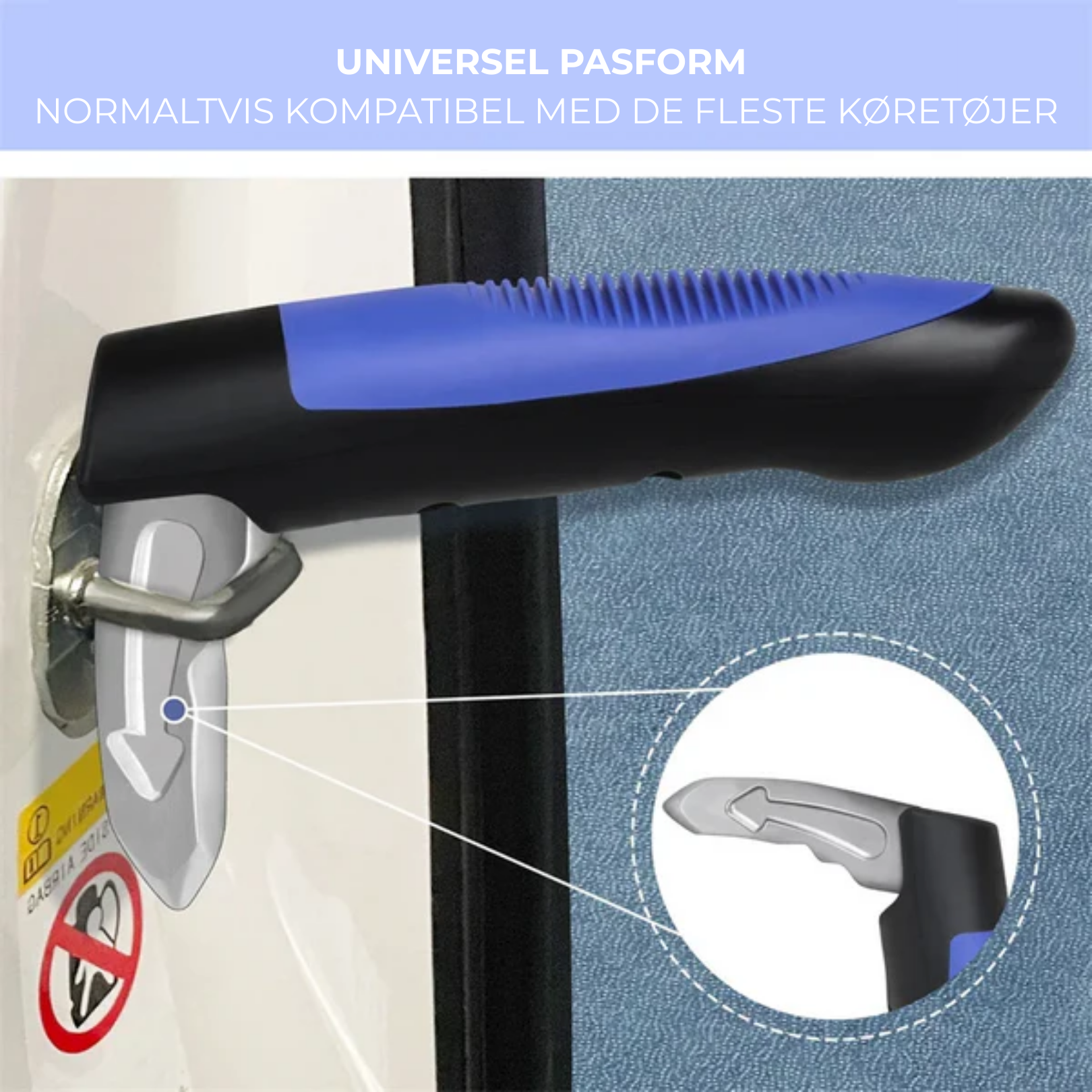 Dette smarte værktøj kombinerer to vigtige funktioner i ét. Det fungerer både som nødhammer til at knuse bilruder og som støttehåndtag til bilens dør. Hav det ved hånden til daglig brug og i nødsituationer.