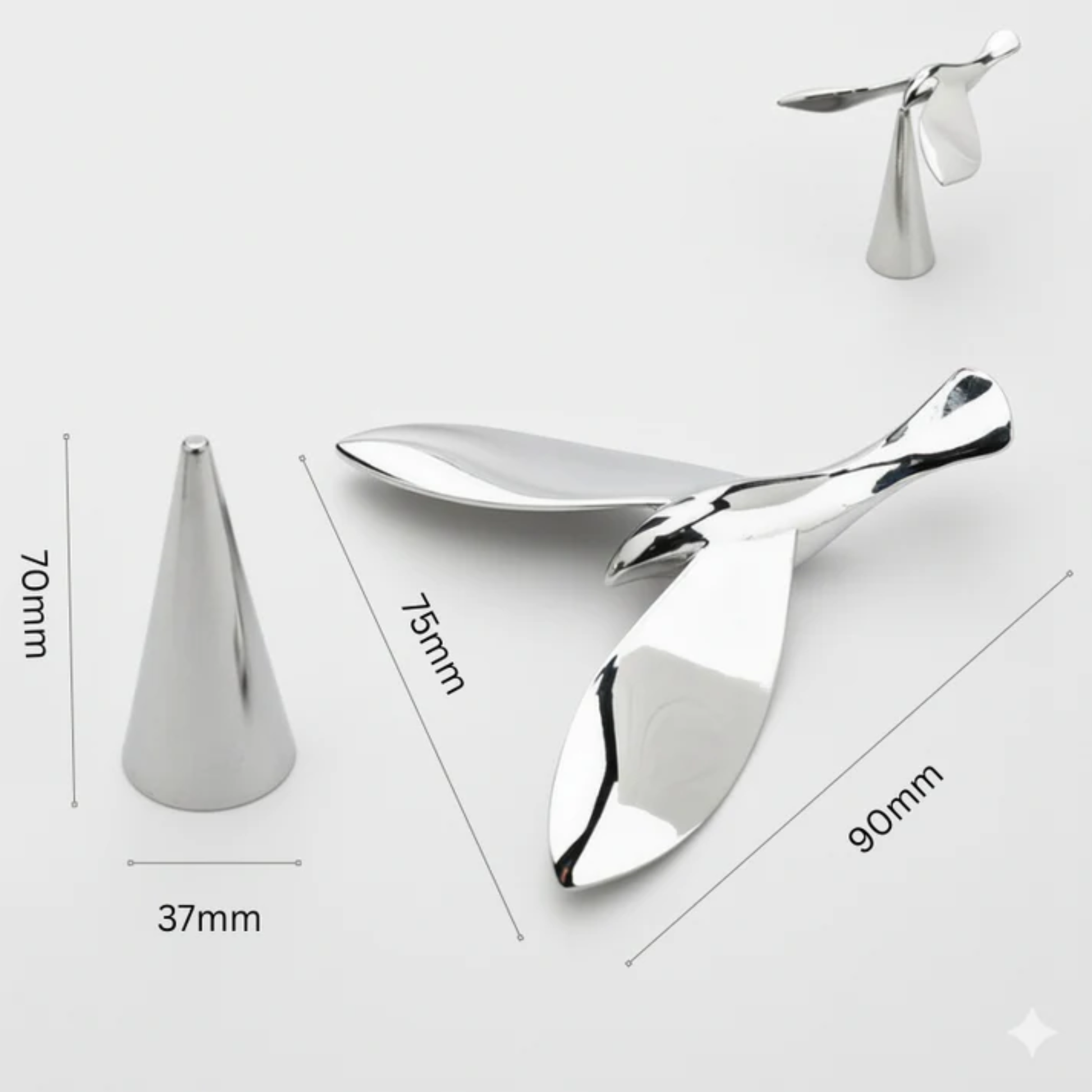 - Materiale: Massiv, støbt zinklegering med spejlpolering.