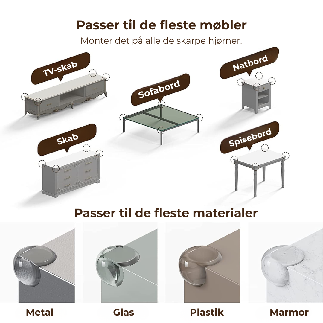 Føl dig tryg med børn i huset. Forebyg alvorlige skader! Blød og stærk til at absorbere maksimal stød. Vores hjørnebeskyttere er transparente, så de matcher dit hjems design samtidig med at de er sikre!