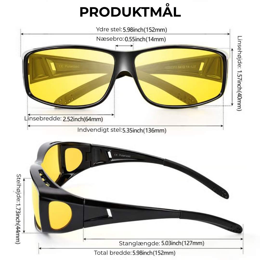 Passer over briller Glider nemt over dine eksisterende briller. Ideel til kontaktlinsebrugere eller personer med normalt syn. Ingen mere squinting gennem blændende lys!