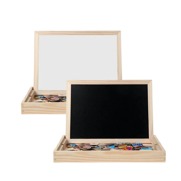 Med magnetiske dyrefigurer, tuscher og kridt kan børn skabe historier og tegne på den dobbeltsidede tavle med både whiteboard og kridttavle – og dermed få uendelige muligheder for læring og leg.