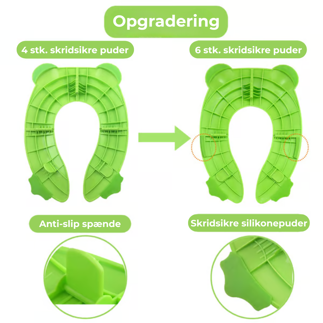 SIKKERHED OG KOMFORT: Vi garanterer maksimal komfort med vores foldbare toiletsæde. Silikonepuderne sikrer, at der ikke sker glid eller klemning. Størrelsen gør, at dit barn ikke falder igennem, når det lærer at bruge toilettet. Og fordi sædet passer til næsten alle standardtoiletter, får dit barn den bedste sikkerhed.