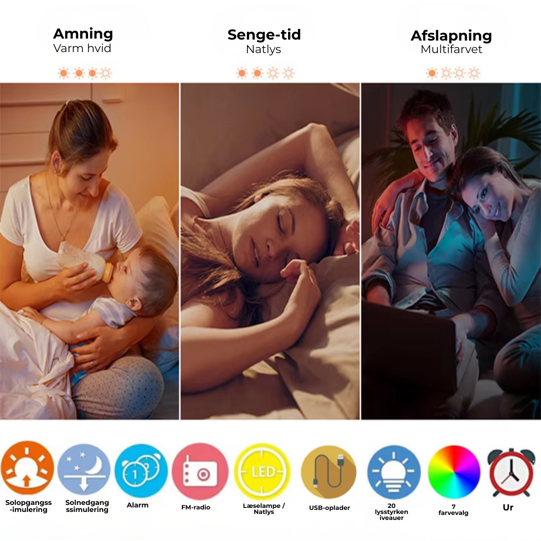 Forestil dig at vågne langsomt, mens rummet fyldes med et varmt morgenlys, der gradvist bliver klarerek, præcis som en ægte solopgang. Ingen pludselige høje alarmer. Ingen stress. Kun en naturlig overgang fra søvn til vågen.